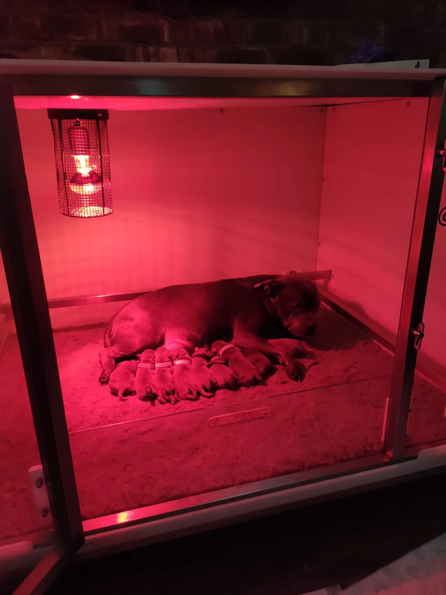 And secondly Rita, the complete opposite, packed full of pups, so much so she came into very early labour which lasted over 24 hours and she delivered naturally 11 pups..... Yes 11 pup !!! This is the reason she came early, the pups were obviously smaller with there being so many and because they were also that little bit early we quicky lost two pups. With the remaining 9 pups ( 5 boys and 4 girls ) we had a challenge to get them feeding quickly and evenly to give them the best chance. We knew if we could get them to their due date in two days time they would be fine.